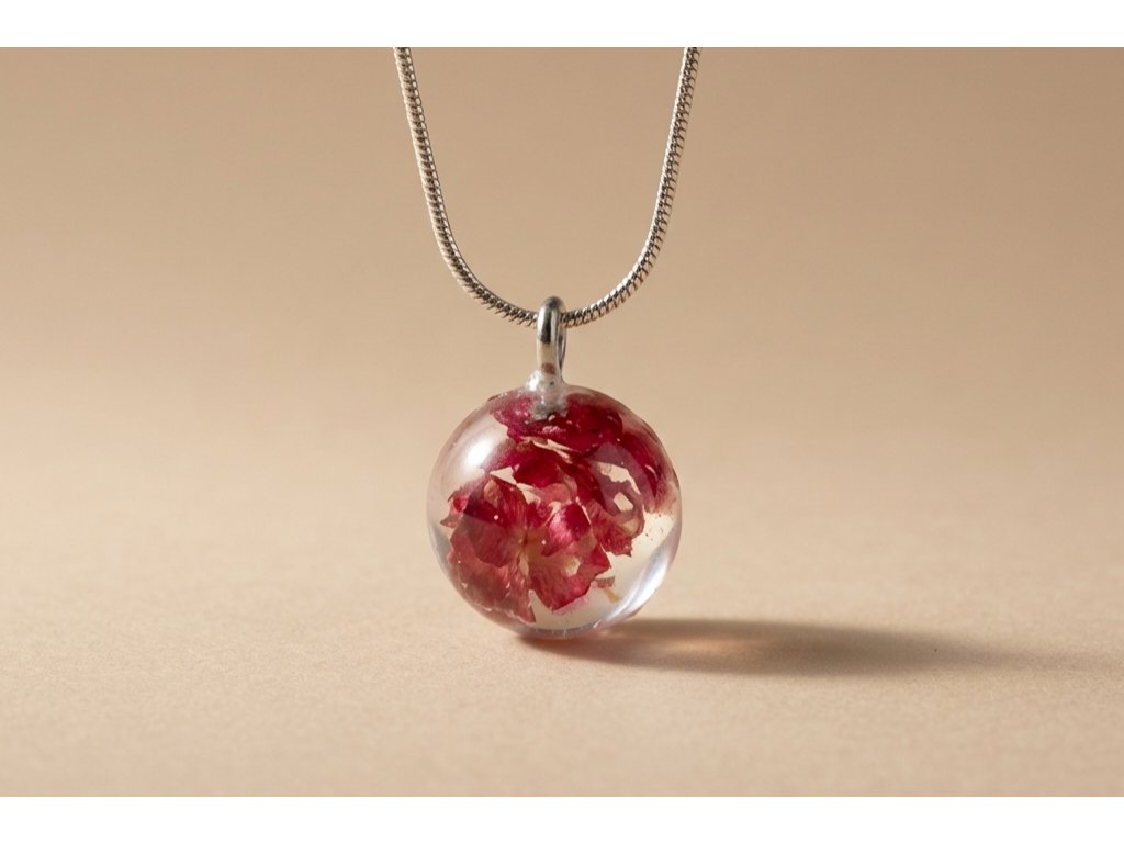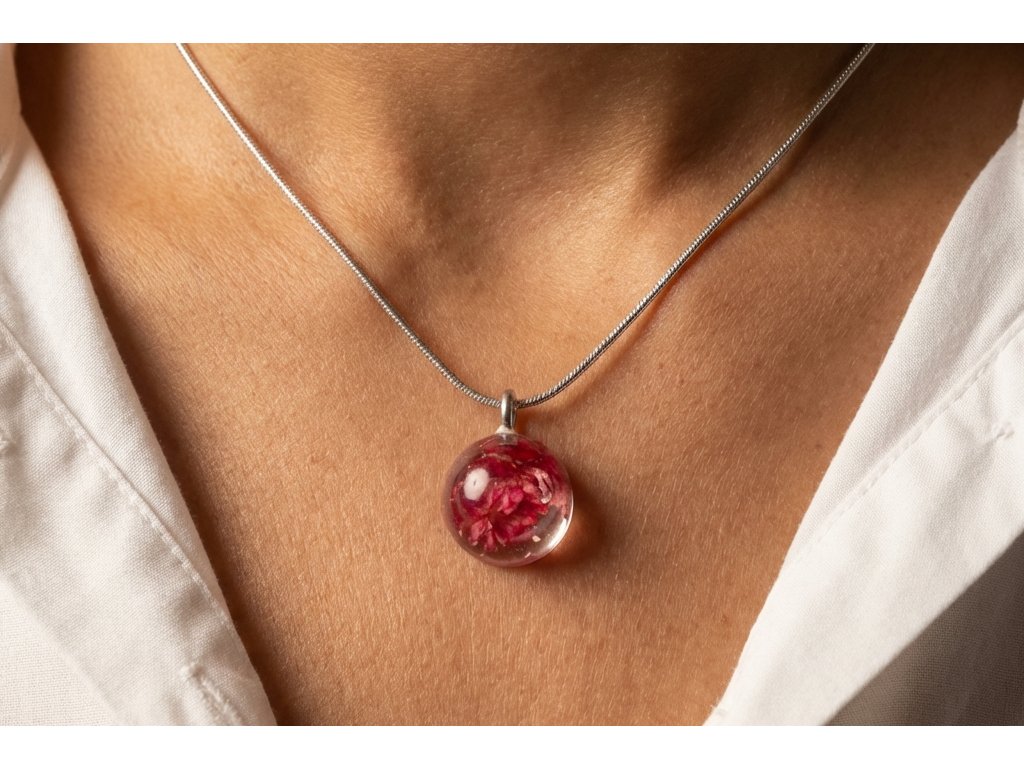 Jemný náhrdelník s květy voskovky neboli begonie plnokvěté zalité do křišťálové pryskyřice.