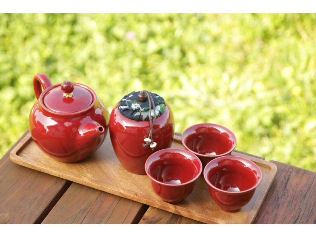 Čajovací set obsahuje větší konvičku, dózu na čaj a tři šálky. To vše navíc v praktickém cestovním pouzdře.