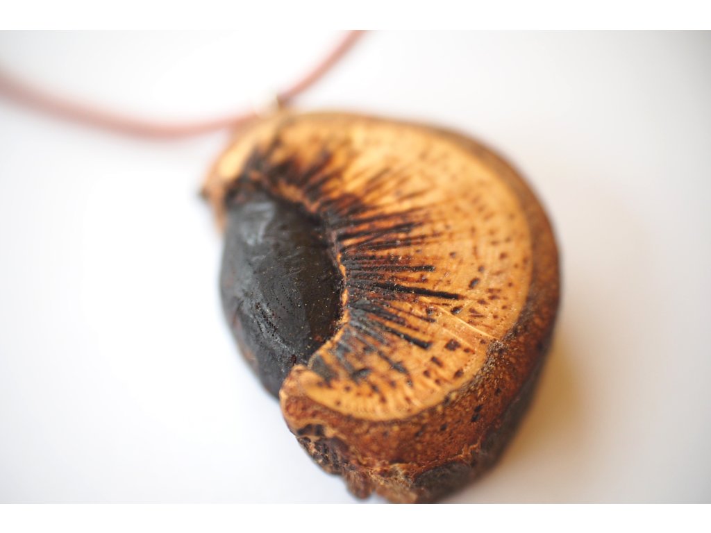 Ručně vyřezávaný přívěsek na kožené šňůrce ve tvaru oka z dubového dřeva.