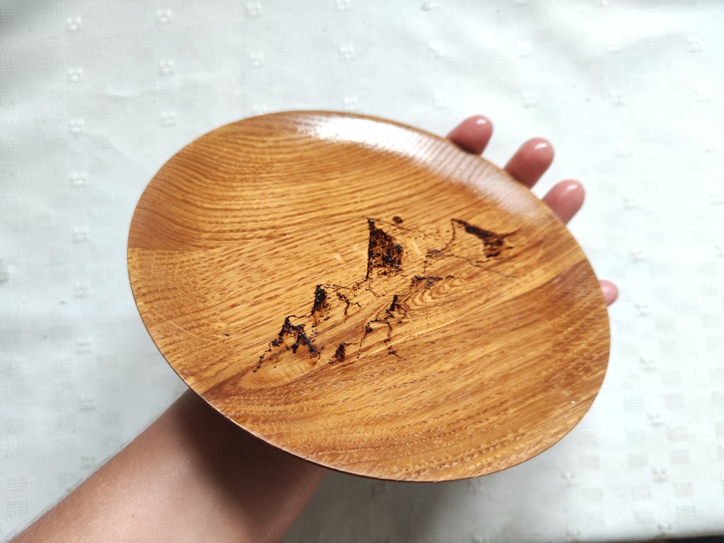 Náš první vypalovaný talíř. Vznikl v rukách skvělého soustružníka Vaška Beránka, abychom ho mohli dále dozdobit o motiv hor. Tuto pro nás novou techniku vypalování do dřeva jsme si moc oblíbili a stále na ní pracujeme a vylepšujeme.