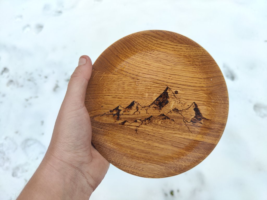 První talíř s motivem hor, které jsme vypálili do dubového dřeva. Ručně a pečlivě soustružený, s vypáleným motivem, který tě bude těšit při každém jídle.