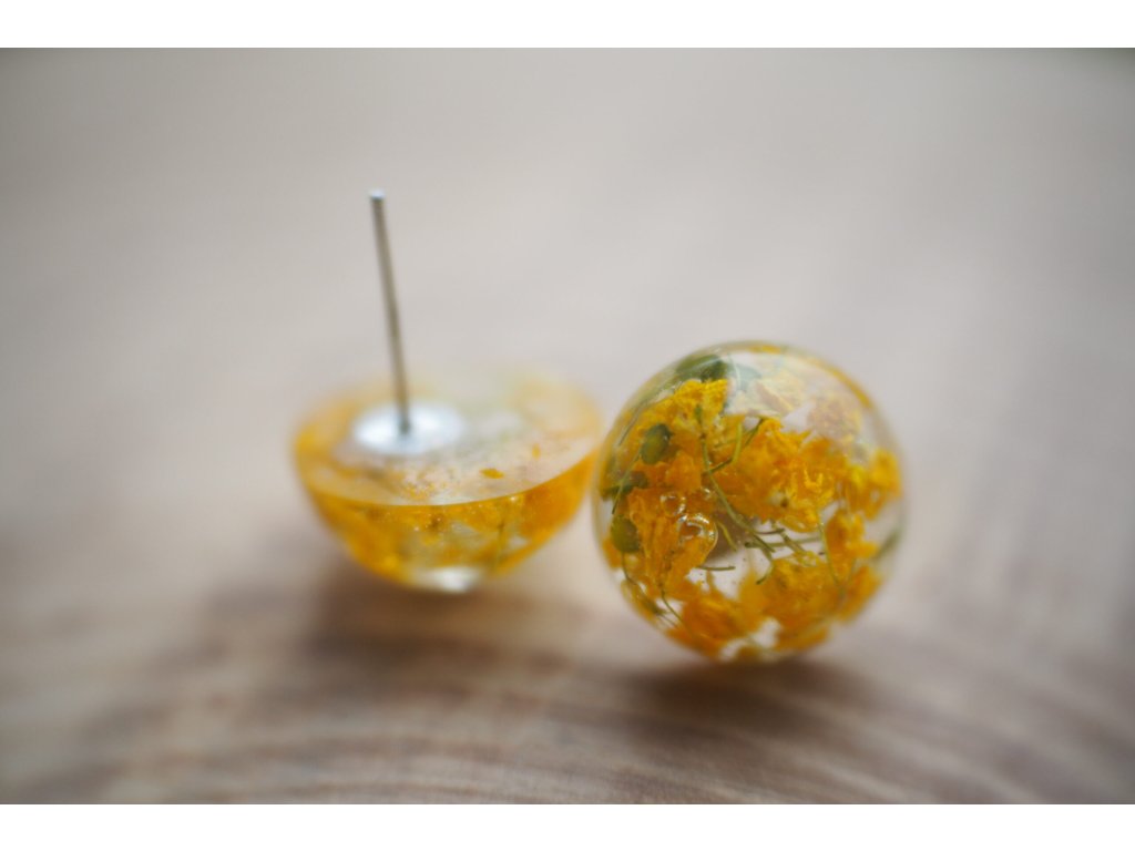 Žluťoučké jemné náušnice plné drobounkých kvítků Tařice skalní. Ručně broušené i leštěné, ošetřené ochranným olejem.