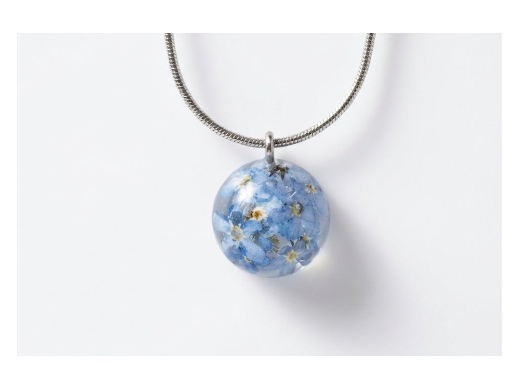 Jemný kvítek světlé modré pomněnky zalitý do křišťálové pryskyřice v rámečku na krk. Drobný, elegantní a přírodní doplněk.