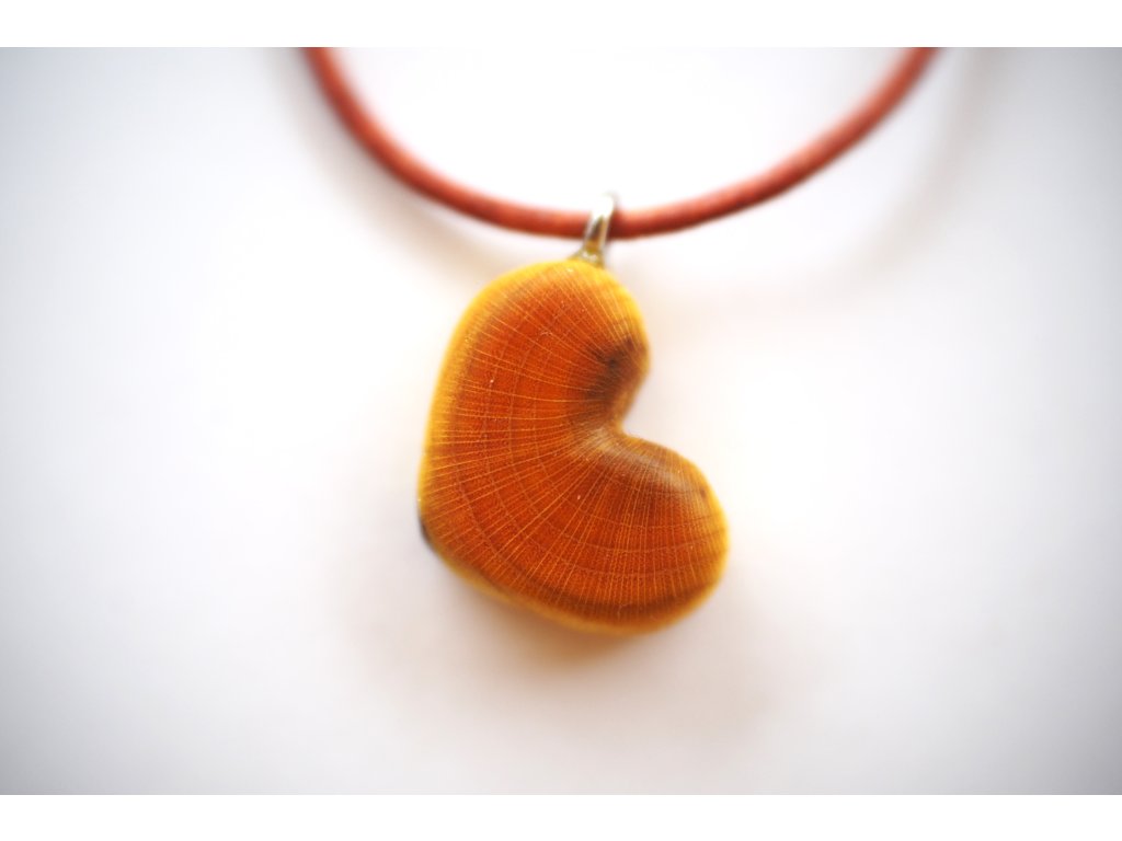 Malý jemný přívěsek z dřišťálu, ručně vyřezávaný do tvaru srdíčka na kožené šňůrce. Dřevo je přirozeně žluté a má paprskovitou kresbu, ručně broušený, ošetřený olivovým olejem.