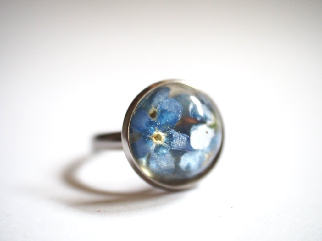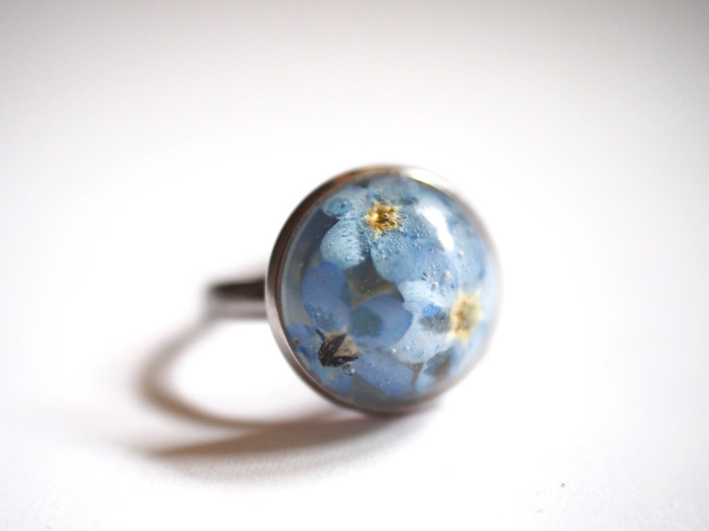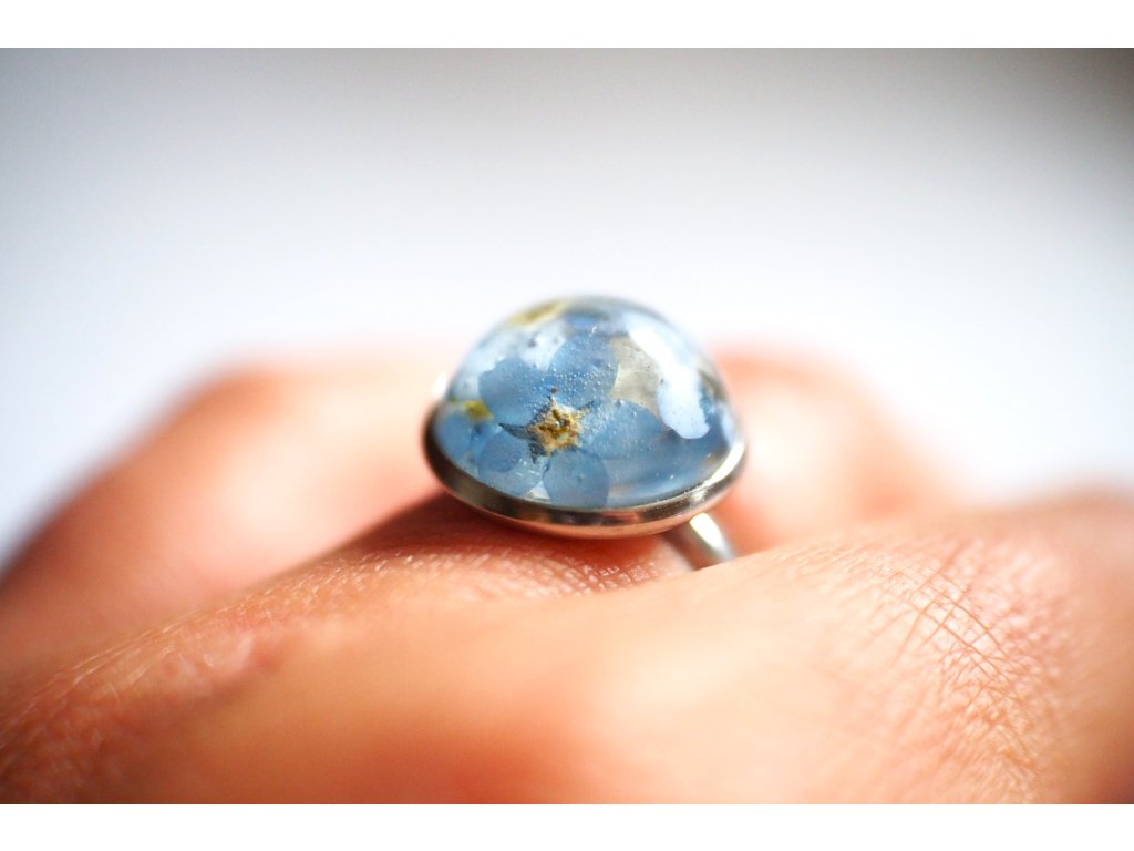 Ručně vyráběný prstýnek s květy pomněnek v pryskyřici uvnitř.